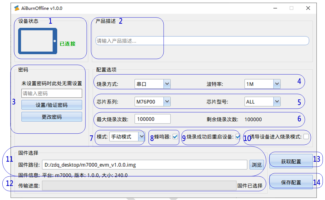 | 14 | 保存配置 | 点击“保存配置”按钮后,上位机会通过 USB 线缆将配置以及固件传输到离线烧录器。 |